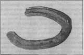Рис. 57. Подкова с возвышением поверхности наружного края, обращенного к поверхности земли, одной ветви подковы для коррекции порока постановки конечностей. При сближенности запястных суставов и косолапости наружную ветвь приподнимают на 6 мм с помощью приваренного проволоки